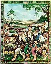 Arguably the best-known rendition of the Jamestown Polish craftsmen is the painting of Poles in Jamestown by Arthur Szyk. The painting was part of a collection in the Polish Pavilion of the New York World Exposition in 1939. It displays 11 Poles, when historical documents state there were "eight Dutchmen and Poles". Historian Arthur Waldo recalled expecting to see only five Poles in the painting, and asked Szyk in-person why he chose to portray 11.[20] Szyk explained that he was inspired to make the painting by a group of historians from the Polish Foreign Office who wanted the painting to be against a summer backdrop.[20] Staying true to history, Szyk chose to paint the second arrival of Jamestown Polish craftsmen, who arrived in 1609, rather than the first group of Poles, who were believed to number five.[20] The painting also shows Poles in tight-fitting trousers and bright decorations characteristic of the mountaineer region, but the black summer cap tops were clearly Krakovian. Szyk explained to Waldo that they were shown as peasants rather than artisans because doing so allowed more creative license in making folk costumes and creating a distinctly Polish look.[20] Szyk, reflecting on his work, took satisfaction in expressing Polish identity and pride through the painting.[20]