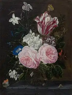 - ↑ Jan Baptist de Crépu, ‘’Bouquet of flowers in a glass vase with butterflies and a small caterpillar on a stone plinth’’ at Koller Auktionen (in German)