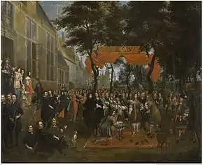 Van Meunincxhove painted two remarkable paintings documenting events which occurred during the residence in Bruges of Charles II of England and his brothers Henry Stuart, Duke of Gloucester and James Stuart, Duke of York in the period from 22 April 1656 to 15 March 1659. On 2 October 1656 the King and his brothers visited the Bruges Guild of the 'Kolveniers' (Guild of Harquebusiers) where the Duke of York successfully shot the target (a parrot). This was cause for great celebration among the local population and was immediately recorded in a poem by Ingelbrecht Cockuyt of the Bruges Chamber of Rhetoric. Van Meunincxhove remembered the same event about 15 years later in two works that were destined for the new premises of the Guild of the Kolveniers (both now in the Groeningemuseum). One of the compositions depicts the celebration meal and the other the King and his retinue in the 'Hoveningen', the walled garden of the Guild. In the second picture depicting the Hoveningen, van Meunincxhove follows the style of genre paintings developed in Flanders after 1660 by artists such as Gillis van Tilborch: he depicts the two groups of three persons on the left foreground on a small scale while the persons surrounding the King have an abnormally long leg which serves to pull the viewer into the depth of the composition. The fabric of the clothing is rendered in rich detail while the artist also depicts some anecdotic details such as the children who climb the wall to better view the event. The second painting depicting the celebration meal includes a representation of the painting of the Hoveningen.[6]