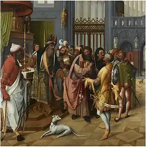 The Adoration of the Magi in the Pinacoteca is central to Jan de Beer's oeuvre. The work was completed in 1515 with the assistance of his thriving workshop. It has been suggested by an art historian that the two wing panels were entrusted by Jan de Beer to the so-called 'Master of Amiens', one of his best students.[9] This theory is not universally accepted.[4] The external sides of the wing panels depict the Annunciation in grisaille, the prologue of the scenes depicted inside. The work found its way to Venice where it may have been located in the convent of Santa Maria Maddalena delle Covertite alla Giudecca or the church of Santa Maria dei Servi. The triptych had previously been attributed to Albrecht Dürer, Lucas van Leyden and Herri met de Bles before it was returned to Jan de Beer by Friedländer.