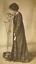 In 1919 Reece returned to visit friends in Los Angeles, and while there she photographed Edward Weston, Tina Modotti and her common-law husband Roubaix de l'Abrie Richey.[9] In keeping with her pictorial style, she posed both Modotti and Richey in costume and gave them "artistic" characters. A photograph of Richey posing as Christ was titled Son of Man, while one of Modotti was called Have Drowned My Glory in a Shallow Cup; this has become one of her best known images. The title comes from a line (from stanza 93) taken from Edward Fitzgerald's 1859 translation of Omar Khayyam's Rubaiyat, "Have drown'd my Glory in a shallow Cup/And sold my Reputation for a Song."[10]