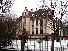 The art high school has its beginning in 1895, when the Latvian Painters Society established a painter's school. In 1928 the school changed its name to Latvian Painters Crafts Promotion and Relief Society Vocational School (Latvian: Latvijas daiļkrāsotāju amatniecības veicināšanas un palīdzības biedrības aroda skola), which again was changed in 1944 to Riga Secondary School of Art (Latvian: Rīgas Mākslas vidusskola), in 1946 to Janis Rozentāls Art High School, in 1998 to Janis Rozentāls Art College (Latvian: Jaņa Rozentāla Rīgas Mākslas koledža), on 18 March 2002 to Janis Rozentāls Riga Art High School (Latvian: Jaņa Rozentāla Rīgas Mākslas vidusskola).[1]