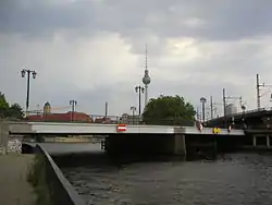 Jannowitz Bridge was dismantled in 1927 to allow construction of the U8 subway line.[2] It was replaced with a new iron girder bridge that opened in 1932, along with the Jannowitzbrücke U-Bahn station. The bridge was destroyed by the Germans, as a "defensive measure", during the Battle of Berlin in World War II. The bridge was rebuilt again in the early 1950s.[1]