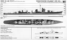 Teruzuki returned to Truk on 18 November and briefly became the flagship of Kimura's Destroyer Squadron 10. She was slightly damaged when she struck a reef at Truk on 3 December. This was quickly repaired as the ship departed for the naval base in the Shortland Islands two days later. Upon her arrival on 7 December, Teruzuki became the flagship of Rear Admiral Raizō Tanaka, commander of Destroyer Squadron 2.[9] By this time the Japanese were forced to deliver supplies to its troops on Guadalcanal via water-tight drums that depended on the currents to take them to their destination. On 11 December Tanaka assembled a convoy of five destroyers carrying drums that was escorted by five additional destroyers as well as Teruzuki. Enroute the convoy survived an attack by 14 Dauntless dive bombers without damage and dropped off their drums without further incident. The convoy turned for home at 01:15 with Teruzuki covering their withdrawal, moving at a speed of 12 knots (22 km/h; 14 mph) near Savo Island. Shortly afterwards, the destroyer was attacked by two or three PT boats;[Note 1] Teruzuki was hit by a single torpedo in the stern. The detonation broke the rudder and one propeller shaft, disabling the ship, while rupturing an oil tank that caught on fire. Tanaka was knocked unconscious by the detonation and was transferred to another destroyer at 01:33, as were some of the crew. The fire could not be controlled and caused the aft depth charge magazine to explode at 04:40, sinking the ship. Nine men were killed, but the destroyers Naganami and Arashi rescued 197 crewmen between them. An additional 156 men were able to swim to Guadalcanal.[19] Teruzuki was stricken from the navy list on 15 January 1943.[9]