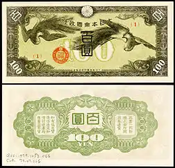 Japanese military currency (Chinese and Japanese: 日本軍用手票, also 日本軍票 in short) was money issued to the soldiers of the Imperial Japanese Armed Forces as a salary. The military yen reached its peak during the Pacific War period, when the Japanese government excessively issued it to all of its occupied territories. In Hong Kong, the military yen was forced upon the local population as the sole official currency of the territory.[1] Since the military yen was not backed by gold, and did not have a specific place of issuance, the military yen could not be exchanged for the Japanese yen. Forcing local populations to use the military yen officially was one of the ways the Japanese government could dominate the local economies.