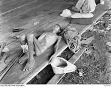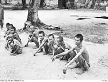 All motor vehicles were confiscated by Japan Transport Co. for limited compensation. The Japanese recruited labours to construct airfields for extra food and payment, while detainees were forced to work.[52] The POWs who worked to build the airstrip also received a small salary weekly, typically enough to purchase an egg.[53] Together with the rest of Southeast Asia, Japan exploited Borneo as a source of raw materials.[54] The Japanese authorities enforced a food self-sufficiency policy. Priority for all resources including foodstuffs was given to Japanese troops with only a limited ration available for the local population. Through Mitsui Morin and Mitsui Bussan, foodstuffs such as rice, maize, tapioca, sweet potatoes and coconut oil were monopolised. Sago supplies were controlled by the Mitsubishi's Tawau Sangyo.[55] Stealing and smuggling were punishable by death. The IJA and the IJN attempted to rebuild the oil industry to contribute to Japan's war effort.[31]