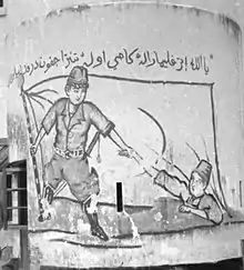A Japanese propaganda mural in Jawi script from a building in the town of Kuching. The text, in the Malay language, reads "Ya Allah, terpeliharalah kami oleh tentera Jepun daripada aniayai" (O Allah, we are saved from persecution by the Japanese troops).