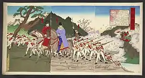 Closely watching the events on the peninsula, the Japanese government had quickly become convinced that the rebellion would lead to Chinese intervention in Korea. As a result, soon after learning of the Korean government's request for Chinese military help, all Japanese warships in the vicinity were immediately ordered to Pusan and Chemulpo.[2] By 9 June, Japanese warships had consecutively called at Chemulpo and Pusan.[4] A formation of 420 sailors, selected from the crews of warships anchored in Chempulo, was immediately dispatched to Seoul, where they served as a temporary counterbalance to the Chinese troops camped at Asan.[5] Simultaneously, a reinforced brigade of approximately 8,000 soldiers of the IJA 9th Infantry Brigade, also known as the Oshima Composite Brigade, under the command of General Ōshima Yoshimasa, was also dispatched to Chemulpo by 27 June and then to Yongsan.[6][7]