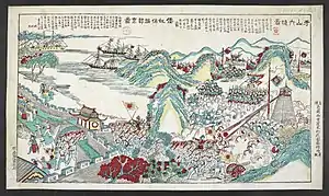 On 1 June 1894, rumors reached the Donghaks that the Chinese and Japanese were on the verge of sending troops, and so the rebels agreed to a ceasefire with the Joseon government to remove any grounds for foreign intervention.[1] On 2 June, the Japanese cabinet decided to send troops to Korea if China did the same. In May, the Chinese took steps to prepare for the mobilization of their forces in the provinces of Zhili, Shandong, and Manchuria.[2] However, those actions were planned more as an armed demonstration to strengthen the Chinese position in Korea than as preparation for war against Japan.[2] On 3 June, King Gojong, on the recommendation of the Min clan and at the insistence of Yuan Shikai, requested aid from the Chinese government in suppressing the Donghak Rebellion. Although the rebellion was not as serious as it had initially seemed and so the Chinese forces were not necessary, the Qing government decided to send 2,500 men under the command of General Ye Zhichao to the harbor of Asan, about 70 km (43 mi) from Seoul. The troops destined for Korea sailed onboard three British-owned steamers chartered by the Chinese government, arriving at Asan on 9 June. On 25 June, an additional 400 troops had arrived. Consequently, Ye Zhichao had about 2,800-2,900 soldiers under his command at Asan by the end of June. [2][3]