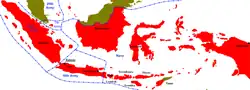 ![]() The former Dutch East Indies (dark red) within the Empire of Japan (light red) at its furthest extent | |||||||||||||||
