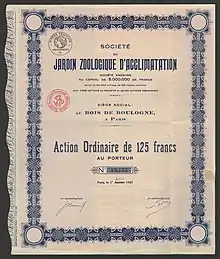 Share of the Soc. du Jardin Zoologique d'Acclimatation S. A., issued 1. July 1927