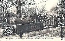 The Jardin d'Acclimatation railway is a 500 mm (19+3⁄4 in) minimum gauge park railway, located in the Bois de Boulogne in Paris. It was opened in 1878 and connects Porte Maillot and the Jardin d'Acclimatation (zoological gardens), 800 meters apart. It was the first passenger-carrying narrow gauge railway of France.