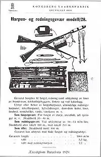Between the wars, several Norwegian gunsmiths attempted to create harpoon guns,[1] intended for hunting seals and shooting rescue lines to boats in distress. Seeing a ready market, and having access to the several thousand Jarmanns in storage, Kongsberg Våpenfabrikk designed a harpoon gun referred to as the M28.[1] As part of the rebuild, the magazine and the repeating mechanism were removed, and the handguard and barrel were shortened. In addition, a heavy rubber shoulderpad was added to reduce the considerable recoil. The rifle could still fire the ordinary 10.15 x 61R cartridge after the conversion. A box could be mounted under the handguard containing up to 300 metres (980 feet) of thin rope. Kongsberg manufactured the M28 harpoon gun until 1952, when they started using the Mauser 98 mechanism in a new harpoon gun called the M52. The sources indicate that around 1,911 Jarmann rifles were modified to M28s,[1] about half of them after World War II.