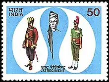 Commemorative stamp celebrating the Jat Regiment in uniforms of the regiment, past and present