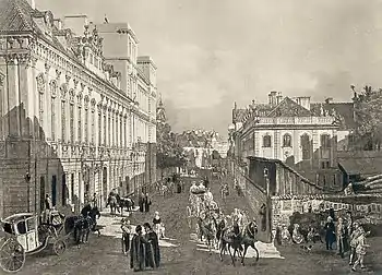 When 1730 at the end of tremendous fireworks at Zeithain which lasted for five hours, instead of the correct "VIVAT" in front of 48 foreign princes and numerous other lords a mistake in writing occurred and a "FIFAT" was illuminated, he gained his cognomen "Fifat".[121] He erected the Palais Jauch in Warsaw's suburb Solec[122] and was architect for a number of prominent baroque buildings in Poland.