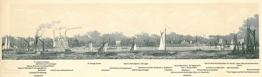 Johann Christian Jauch senior (1765–1855) served from 1820 until 1833 as dyke-count and first dyke count (German: Ältester Deichgeschworener) of Hamburg-Hammerbrook.[46] He was in charge as first dyke count when the dam failed during the February flood of 1825,[77] 2.000 feet southeast of the Jauch house Stadtdeich 10 in Hamburg. [78]