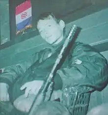 In July 1991, he boarded the train and arrived in Zagreb completely alone.[1] There he joined the Croatian Defence Forces[3] and was sent off to the front along the Kupa river in Banovina.[1]