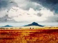 The images represent the diversity of the Australian landscape and include "the filmy veil of greenness' seen from Isherwood's own window, a flood on the Darling River, a bushfire in the Blue Mountains and a forest of ringbarked trees near Armidale. This latter painting is one of Isherwood's most masterly works, showing her exceptional control over both the watercolour technique and perspective. As is usual in a watercolour, those parts of the painting which are white are left unpainted, in this case a forest of dead tree trunks. In the narrow spaces between the array of trees Isherwood has painted a landscape that rolls away in layers to the distance. The subject would have been impressive, in oils. In watercolour, however, the technical demands are extraordinary, as is the facility with which it has been achieved. The paintings were eventually put on permanent display in the Gunnedah Bicentennial Regional Gallery. Isherwood set about painting a series of oils based on the watercolours. These were exhibited at the Artarmon Galleries in Sydney in 1986.