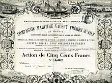 In 1845 the Compagnie Valéry placed an order with the shipyard of La Ciotat for the steamship Bonaparte, an innovative design with an iron hull and a propeller. Construction started that year, but was long and difficult.[7] The Bonaparte was launched on 17 January 1847.[5] The trials gave excellent results, with much lower fuel consumption per horsepower per hour than paddle boats.[7] On 19 October 1847 the Bonaparte collided with the Comte de Paris during the night and sank.[5] Between 1840 and 1883 forty-six ships flew the flag of the Compagnie Valéry.[8] In 1850 Valery Freres took over the dispatch service abandoned by the French government's postal packet boats.[9]