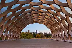 Gang's extensive built work in the Chicago area includes St. Regis Chicago, University of Chicago Campus North Residential Commons,[23] Writers Theatre,[24] City Hyde Park,[25] the WMS Boathouse at Clark Park and Eleanor Boathouse at Park 571[26][27] on the Chicago River, Northerly Island, Aqua Tower, the Nature Boardwalk at Lincoln Park Zoo,[28] the Columbia College Chicago Media Production Center,[29] Solstice on the Park[30], and the SOS Children's Villages Lavezzorio Community Center[31]. In 2014, Gang and her Studio completed the Arcus Center for Social Justice Leadership at Kalamazoo College.[32]