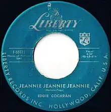 "Jeannie Jeannie Jeannie" is a song by Eddie Cochran recorded and released as a single in January 1958 on Liberty Records 55123. It was a minor hit for Cochran and stalled at number 94 on the Billboard charts.[1] "Jeannie, Jeannie, Jeannie" was posthumously released in the United Kingdom in 1961 on the London Records label and rose to number 31.[2] Later versions are most commonly known as "Jeanie, Jeanie, Jeanie". The song was first written as "Johnny, Johnny, Johnny" for The Georgettes, but they never recorded it.[3]
