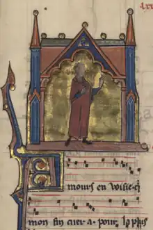 Jehan was probably born at Grévillers near Arras. A certain "Grieviler" is mentioned in the necrology (registre) of the Confrérie des jongleurs et des bourgeois d'Arras under 1254. Elizabeth Aubrey argues that since Jehan was a known member of the Puy d'Arras, he cannot be identified with the "Grieviler" of the necrology. More recent work on these institutions by Carol Symes has suggested they were in fact the same.[1] Nonetheless, a further piece of evidence for establishing his chronology are the songs he is known to have composed with Adam de la Halle, who was very young in the 1250s. Probably Jehan was one of the sixteen unordained married clerics in minor orders who petitioned the Bishop of Arras on 28 January 1254 to exempt them from secular taxation. They were evidently involved in trade and commerce.