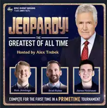 On November 18, 2019, ABC announced that the three highest-earning Jeopardy! contestants of all time—Jennings, Rutter, and Holzhauer—would compete in a best-of-seven prime-time tournament, Jeopardy! The Greatest of All Time. The first contestant to win three matches receives the title and a grand prize of $1 million. The others receive $250,000 each.[14] The series was produced by Sony Pictures Television, with Harry Friedman executive producing and Alex Trebek hosting.[15] This marked the first time Jeopardy! had aired on network television instead of in syndication since Super Jeopardy!, a prime-time tournament that aired in 1990 and was also hosted by Trebek.[4] ABC Owned Television Stations group has been the lead broadcaster of the syndicated version for most of its run.[3] In addition to ABC, the tournament was broadcast in Canada on Yes TV and two of its partner stations, CHEK and NTV, all of which also carry the syndicated version.[16][17][18] The series began taping on December 10, 2019.[19]