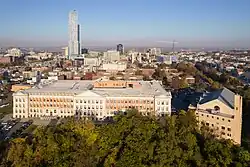 Originally named Jersey City High School, the property was purchased in 1904 and the new building opened on September 6, 1906, in an attempt to relieve overcrowding in the city's public schools.[13][14] It was the first public secondary school in the city. When the school opened, it housed a 2,000-seat auditorium that saw extensive public use, and hosted such events as a lecture by Helen Keller and political rallies for United States Presidents Taft, Wilson, and Roosevelt. The original school was expanded with the construction of a second building in 1912 to further industrial skills education. This building contained a foundry, print shop, and vocational classrooms.[15]