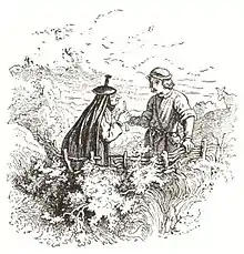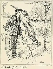 The maiden asks the shepherd for a kiss in exchange for a hare. Illustration by Henry Justice Ford for Andrew Lang's The Violet Fairy Book (1901).