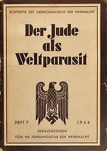 Through this comparison with parasites, pests and diseases the Jews were systematically denied to be human beings. Nazi propaganda was able to tie in here with the medieval image of the Jew as a well poisoner. However, these comparisons became much more important as a result of the more widespread knowledge of medicine and hygiene in the 20th century.[72] The only solution that remained in this logic was the physical extermination of the alleged pests, the Holocaust.[73] In the Nazi training literature, this consequence was repeatedly openly addressed. For example, in "Training Foundations for the Reich Themes of the NSDAP for the Year 1941/42" it was stated that a body infested with bacteria had to overcome these parasites, or it was overcome by them. He then had to take care to prevent a new infection in the future. This is also the case in people's lives:
