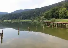 Jezero is a clustered village on a semicircular plain between Saint Anne's Church to the west and Saint Lawrence's Church to the northeast. South of the village in the Zajezero Plain there are low-lying wet meadows and 37-meter (121 ft) deep Lake Podpeč (Slovene: Podpeško jezero or Jezero pri Podpeči). The lake is fed by several springs in the nearby forest and contains trout, carp, and pike.[4] The main tributary of the lake is Mill Creek (Mlinski potok), a constant surface watercourse. The lake drains through a siphon at the bottom, later emerging to the northwest as Hruški Creek (Hruški potok), a tributary of the Ljubljanica River.[5] Swimming is permitted in the lake at one's own risk.[5] Below Saint Lawrence's church are several sets of fields known by the microtoponyms Rušne, Deli, and Cervenke. A water main is connected to Jezero from the hamlet of Podkamnik in the neighboring village of Kamnik pod Krimom. There are several karst caves in the vicinity, including Frog Caves (Krkonove jame), Peršin Shaft (Peršinovo brezno), Little Woods Cave (jama v Malih gozdih), Lipovec Shaft (brezno v Lipovcu), and Big Peak Shaft (brezno pod Velikim vrhom).[4]