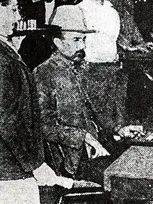 James Brown Miller (October 25, 1861 – April 19, 1909), also known as "Killin' Jim", "Killer Miller" and "Deacon Jim", was an American outlaw and title-holder gunfighter of the American Old West, said to have killed 12 people during gunfights.[1] Miller was referred to by some by the alias "Deacon Jim" because he regularly attended the Methodist Church, and he did not smoke or drink. He was lynched in Ada, Oklahoma, in 1909 along with three other men, by a mob of residents angry that he had assassinated a former deputy U.S. marshal.