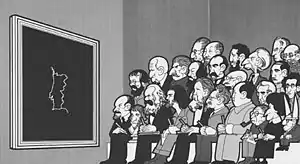 His political intervention is intensified in 1974 and 1975, straight after the fall of the dictatorship, hurling himself into "the battle with redoubled keenness, multiplying himself in caricatures, posters and hoardings with a markedly revolutionary orientation", and becoming the "maximum artist, perhaps the only one, after all, that the April revolution called upon".[5] He questioned the identity of a country in turmoil in drawings such as A Difficult Problem, where a group of outstanding figures from the past – from Karl Marx to Trotsky and Sartre – stare inquisitively at a small map of Portugal on a blackboard. João Abel Manta "will be associated in a very particular way to the best and worst that we lived through in Portugal during those years".[6]