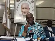 Afterwards, Yhombi-Opango was the candidate of his party, the Rally for Democracy and Development (RDD), in the August 1992 presidential election, taking sixth place with 3.49% of the vote.[14] In his native Cuvette Region, he placed second, with 27% of the vote, behind Sassou Nguesso.[15] He allied with President Pascal Lissouba and Lissouba's party, the Pan-African Union for Social Democracy (UPADS), in the first round of the 1993 parliamentary election, held in May, and after the election Lissouba appointed him as Prime Minister on 23 June 1993. The opposition contested the results, however, and a severe political dispute erupted, with the opposition setting up a rival government.[16] Yhombi-Opango resigned on 13 January 1995 so that Lissouba would be free to consult other parties in the formation of a new government; he was promptly reappointed as Prime Minister, with a new government—including four members of the opposition Union for Democratic Renewal (URD)—being named on 23 January.[17]