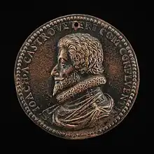 Joachim de Châteauvieux, baron de Verjon puis comte de Confolant (c. 1545–c. 1615)[1] was a French governor, military officer, royal guard and favourite, during the French Wars of Religion and early Seventeenth-Century. Born into a noble family from Bresse with a history of royal service, Châteauvieux came to the attention of the royal family during the siege of La Rochelle in 1573, part of the fourth French War of Religion. The siege was led by the king's brother Anjou, and after Anjou was elected as king of the Commonwealth, Châteauvieux travelled with him to his new kingdom, serving as a member of his household during his brief reign there before he returned to France as Henri III. Back in France, Châteauvieux was again made a member of the king's household. In 1578, the king's long serving captain of the Scots Guard died, and Henri chose Châteauvieux for the prestigious post. In the following years he received both of the royal orders, that of Saint-Michel and Saint-Esprit.