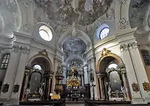 In early 1845, Krall was the chorus director of the Music Society of the Piarist Church, Vienna ('Piaristenkirche Musikverein').[6] The church (finished 1758) dedicated to Maria Treu (Faithful Maria) has a long-standing musical tradition because of its excellent acoustics: the Piarists, the oldest Catholic educational order, had commissioned Haydn's Missa in tempore belli, first performed there in 1796. A church musical society ('Musikverein') was first established there in 1828 by Baron Joseph von Blumenthal, who was also the Chordirektor. The high cost of the productions (copying of parts etc.) led to its disbanding in 1834.[7]
