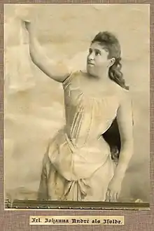 Johanna André (30 June 1861  23 June 1926) was a German soprano in opera and concert and a voice teacher. A long-term member of the Braunschweig Court Theatre, she appeared at major German opera houses, especially in dramatic roles such as Beethoven's Fidelio, and Wagner's Senta, Isolde and Brünnhilde. She took part in the world premiere of Wagner's Parsifal at the Bayreuth Festival.