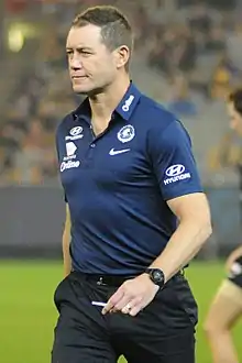 Barker went to be an assistant coach at the Carlton Football Club since the 2011 season.[12] On 26 May 2015, following the mid-season sacking of Mick Malthouse as senior coach of Carlton, Barker was appointed caretaker senior coach of the Carlton Football Club until the end of the 2015 season.[13][14][15][16][17][18][19] He coached the club to three wins from the final fourteen matches, and was one of the front-runners for the senior coaching role before it eventually went to Brendon Bolton.[20][21][22][23] Barker, however still remained at the Carlton Football Club as an assistant coach in the position of stoppages coach.[24][25]