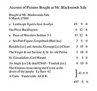Two auctions of Blackwood's property give a measure of how much he had personally amassed in his life. On 21 February 1778, Messrs. Christie and Ansell auctioned his "much distinguished, and valuable collection of pictures, fine bronzes, sepulchral urns, bustos, etc." More than forty painters were listed, including Velazquez, Poussin, Rubens, Rembrandt and Cuyp.[13] Later that year a two-day auction was held of "The Improved Lease of the Genteel House, with convenient Offices, double Coach-House, and Stabling for Five horses, situated on the east side of Soho-square", together with furniture, wines and pictures.[14]