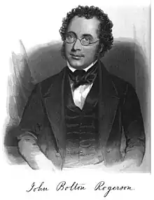 John Bolton Rogerson was born at Manchester on 20 January 1809, the son of James Rogerson by his wife, Elisabeth.[1] At the age of thirteen he left school and began work in a mercantile firm, but was afterwards placed with a solicitor. Law being distasteful, he opened in 1834 a bookshop in Manchester, which he carried on until 1841. The next few years were devoted to literary work, and in 1849 he was appointed registrar of the Manchester cemetery at Harpurhey. He was an amateur actor, was president for some years of the Manchester Shakespearean Society, and was for a short time on the staff of the Manchester Theatre Royal. In youth he had written a play in three acts, called The Baron of Manchester, which was produced at a local theatre. He also lectured on literary and educational subjects.[2]