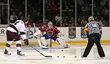 Carlson takes a shot against Cedrick Desjardins during an AHL All-Star event in 2010