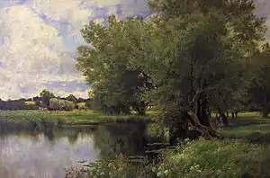 In 1873 Adams moved to "Brackenhurst", Ewhurst Hill, near Guildford.[2] Most of his landscapes depict scenes from counties in southern England, particularly Surrey. However, he also painted a few Scottish works featuring the River Tweed.