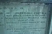 In 1835, his last lecture to students of the Royal Academy, in which he praised Raphael and called the Academy the "cradle of British art", was "cheered most heartily".[57] He died on the night of 31 March 1837, apparently from heart failure, and was buried with Maria in the graveyard of St John-at-Hampstead Church in Hampstead in London. (His children John Charles Constable and Charles Golding Constable are also buried in this family tomb.)