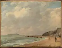 Constable’s pleasure at his own success was dampened after his wife started displaying symptoms of tuberculosis.[46] Her growing illness meant that Constable took lodgings for his family in Brighton from 1824 until 1828,[2] in the hope the sea air could restore her health.[47] During this period Constable split his time between Charlotte Street in London and Brighton. This change saw Constable move away from large scale Stour scenes in favour of coastal scenes.[48] He continued painting six-foot canvases, although he was initially unsure of the suitability of Brighton as a subject for painting.[49] In a letter to Fisher in 1824 he wrote