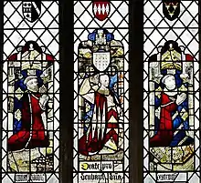 The family Badge of the Dynhams was the head of a hart, again in allusion to Hartland Abbey,[37] Lord Dynham's personal badge comprises: "a topcastle of a warship, broken at the mast, with five javelins resting inside the structure against the railing, and flying a swallow-tailed pennant with red and white streamers and a cross of Saint George next to the staff" and is repeated eleven times throughout the millefleurs ground, which was originally dark green, but appears blue today.[26][38] Most scholars agree that the badge of the topcastle is a reference to Lord Dynham's naval career spanning the reign of five English Kings (from Henry VI to Henry VII) and is perhaps symbolized by the five javelins that rest inside the topcastle.[26][39]