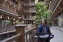 Multidisciplinary artist John Elliott sitting in the Cleveland Arcade building in downtown Cleveland.