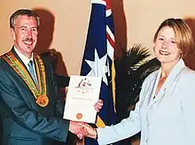 South Sydney Mayor John Fowler presents a Certificate of Australian Citizenship to future Premier of New South Wales Kristina Keneally