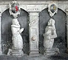2. Above each is an heraldic escutcheon showing arms of Giffard impaling the arms of his respective wife. Above Arthur are shown the arms of Leigh of Burrough, Northam (Argent, a lion rampant gules on a sinister canton azure an escallop or[6] and above John are shown the arms of Wyndham (Azure, a chevron between three lion's heads erased or).