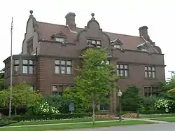 The original house was built in 1857 and is a two-story, brick structure that now serves as the rear wing. Between 1905 and 1909, the main block was constructed.[2] The main house is a 2+12-story, maroon brick with limestone trim designed as an English Manor house, with 38 rooms, 10 bathrooms, and seven fireplaces.[3]:2