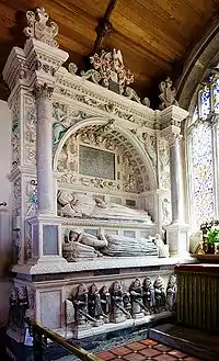 Sir John Hele (c. 1541–1608)[2] of Wembury in Devon, serjeant-at-law, was a Member of Parliament for Exeter and was Recorder of Exeter (1592–1605). He was one of Prince's Worthies of Devon (1701).[3] He built at Wembury one of the grandest manor houses ever seen in Devon, called by his near contemporary Risdon (died 1640): "A magnificent house, equalling, if not exceeding, all other in these western parts, for uniform building; a sightly seat for shew; for receipt spacious; for cost sumptuous; for sight salubrious".[4][5] It was already a ruin by about 1700,[6] and was finally demolished in 1803.[7] He founded a boys' hospital in Plymouth.[8] His monument and effigy survives in Wembury Church.